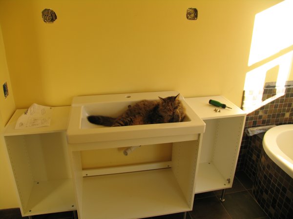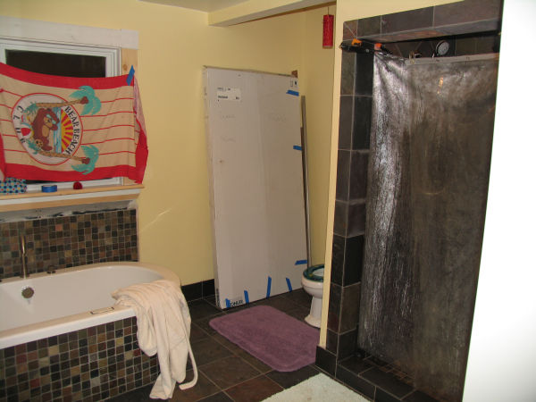 The fixtures in the new bathroom are all installed, and the old one cut out. Windows are trimmed and the main task remaining is to install the shower door. After 9 weeks of doing without, we have a washer & dryer again.