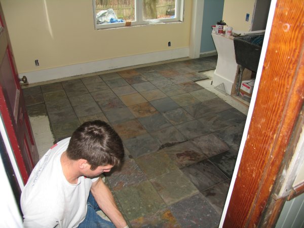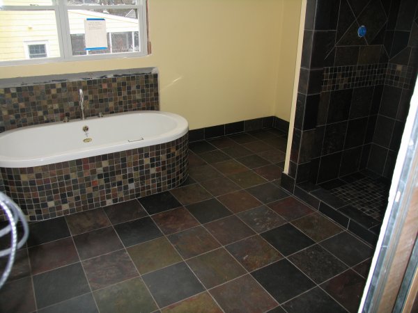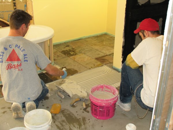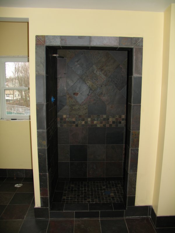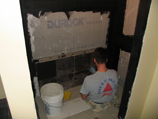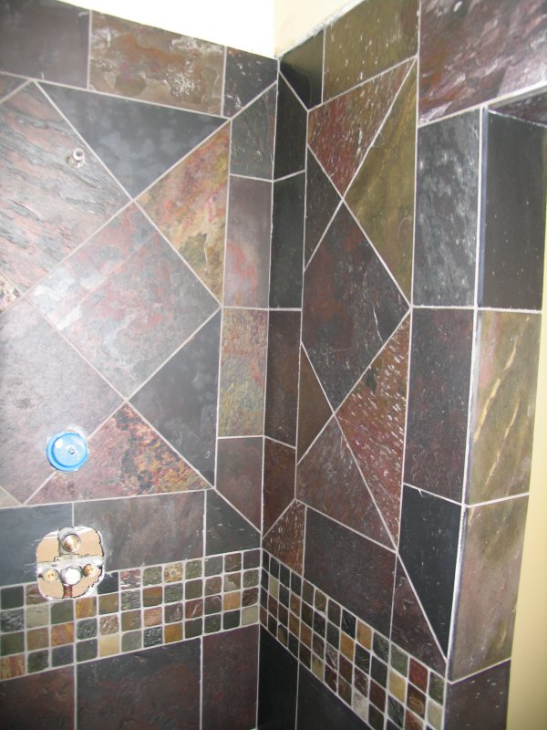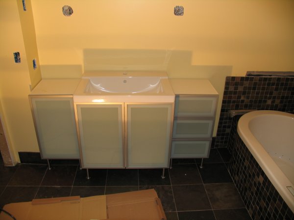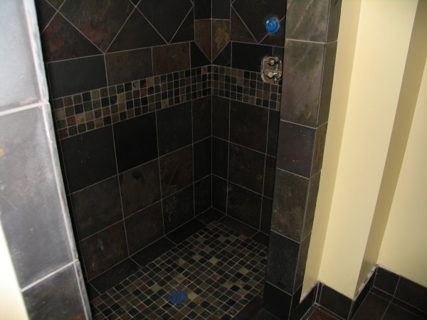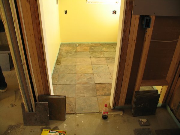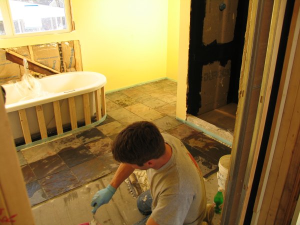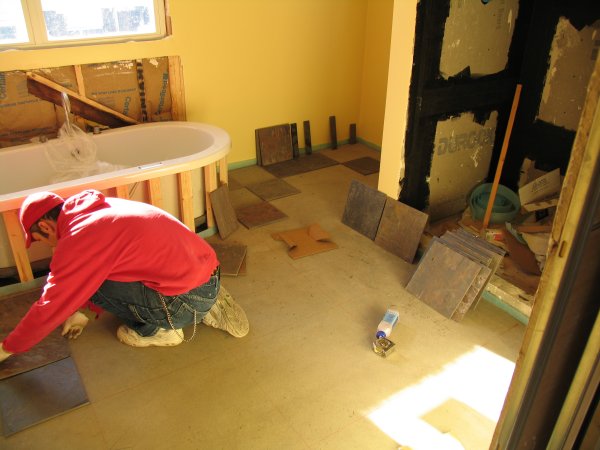 The plaster walls are up, the bathroom is being tiled in slate, plus finishing up the outside.