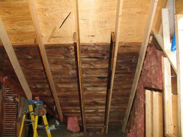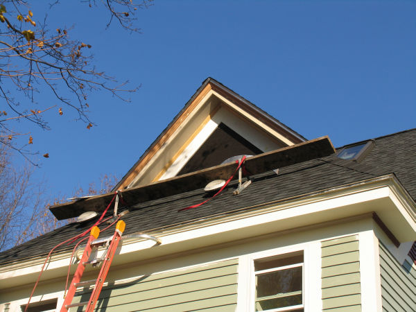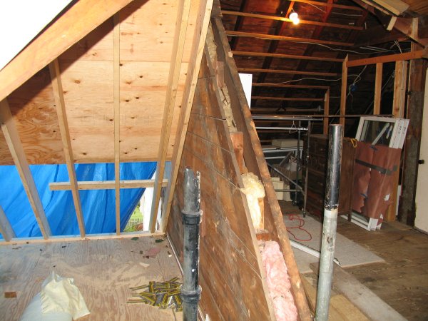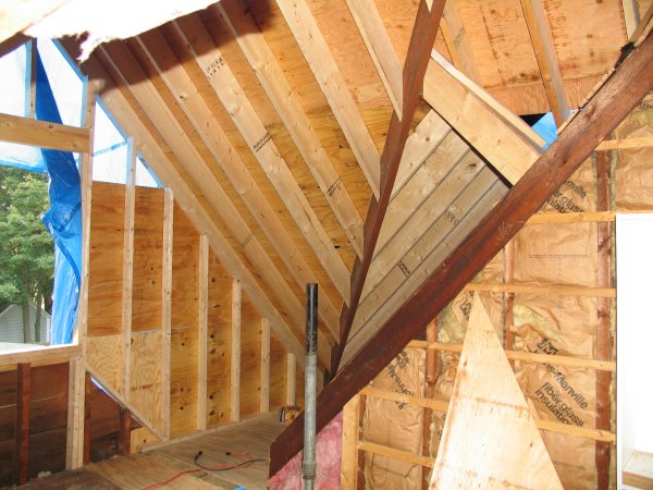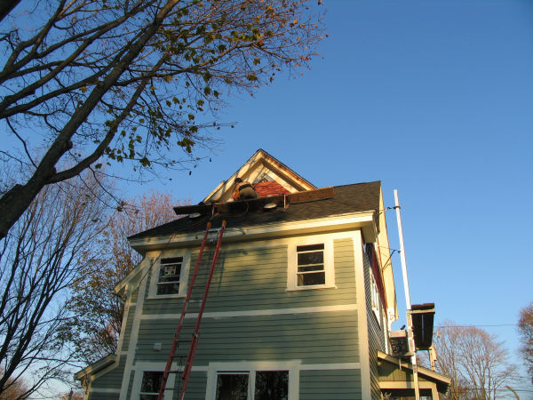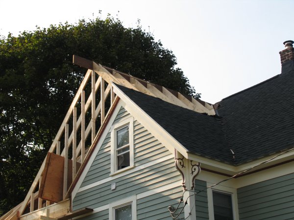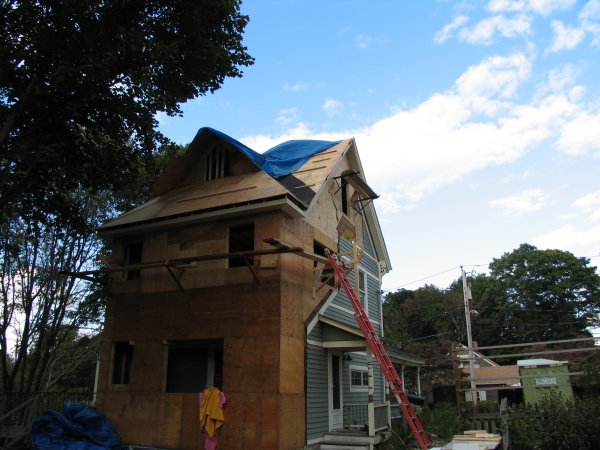 Today they took out the old hip & valley framing, opening up the space into the new 3rd floor area. The roof sheathign was finished and the shingling started.